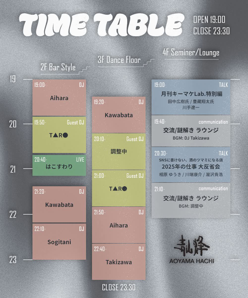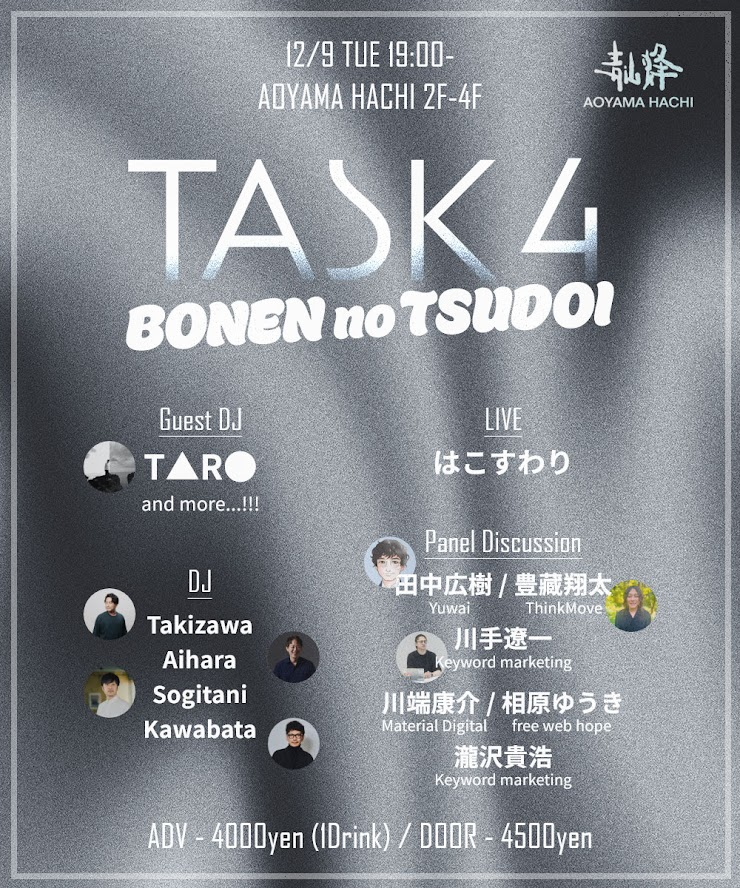2025年12月9日、東京都渋谷区の「青山蜂 Aoyama HACHI」にて開催される「12/9 TASK4 忘年会」にて、パネルディスカッション「月刊キーマケLab.特別編」を開催する運びとなりました。